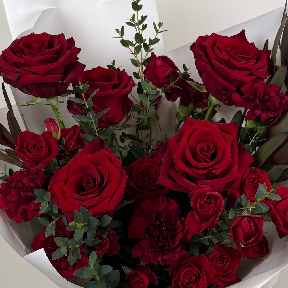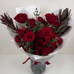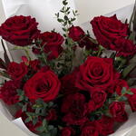 Red rose - 7 pcs Leucadendron - 2 pcs carnation - 4 pcs red spray rose - 5 pcs eucalyptus stems - 3 pcs
