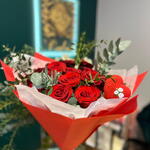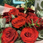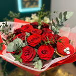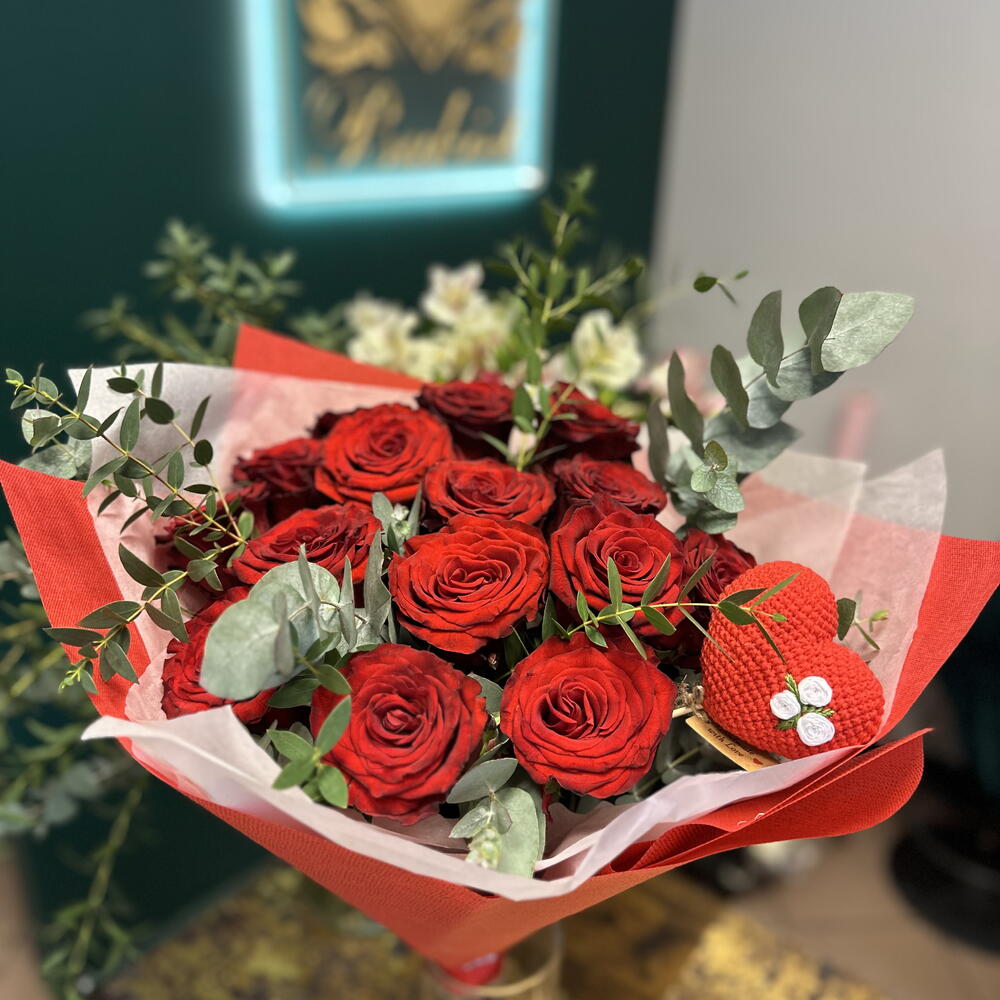 Eucalyptus - 5 pcs Ruscus - 3 pcs radiant red roses - 15 pcs heart hand made - 1 pcs