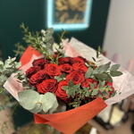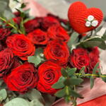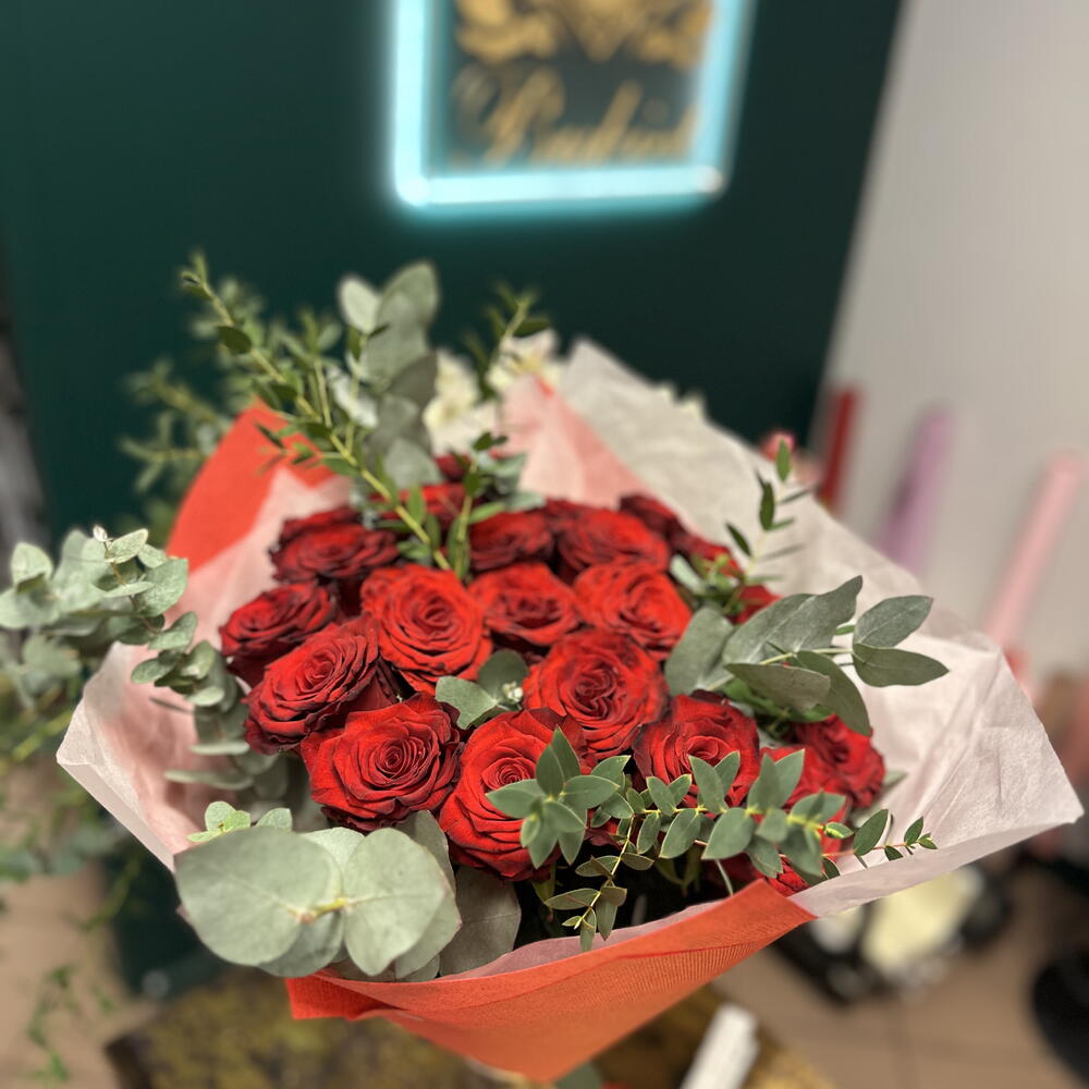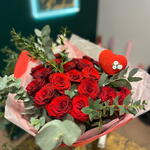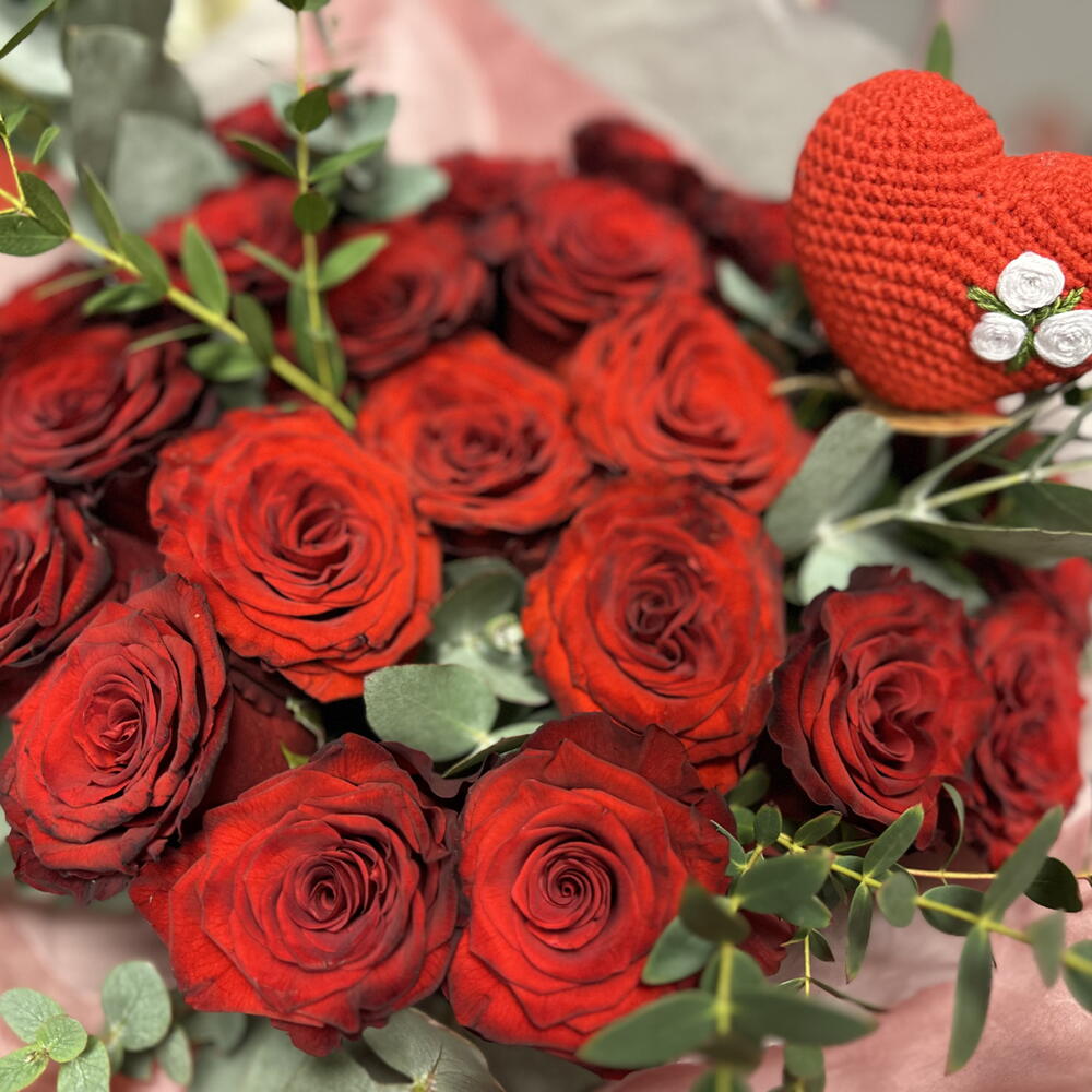 Eucalyptus - 7 pcs Ruscus - 5 pcs radiant red roses - 21 pcs heart hand made - 1 pcs
