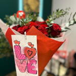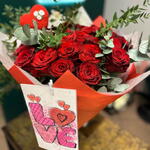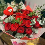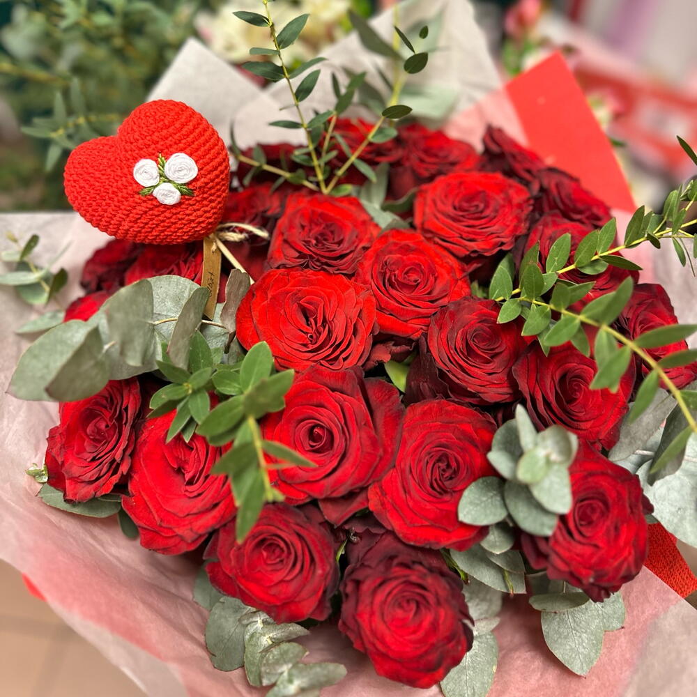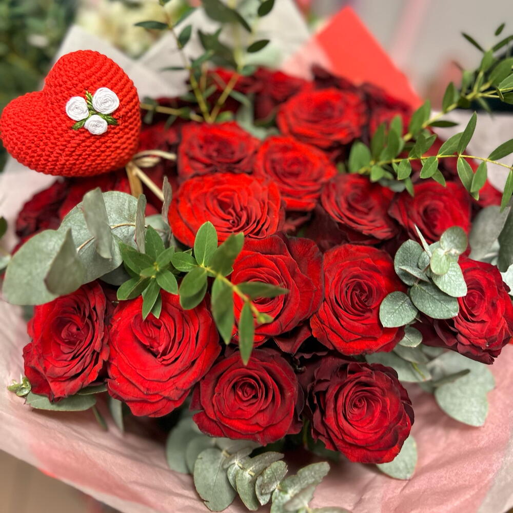 Eucalyptus - 7 pcs Ruscus - 5 pcs radiant red roses - 25 pcs heart hand made - 1 pcs postcard hand made - 1 pcs