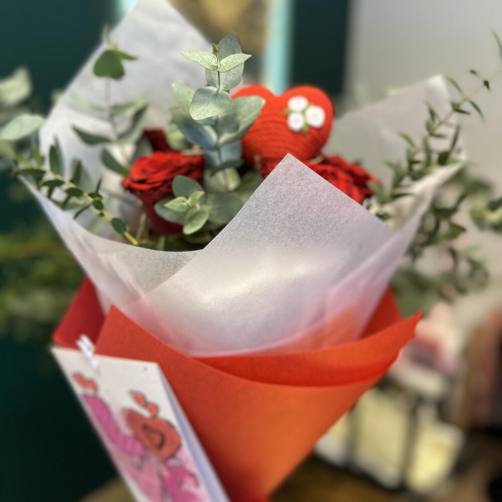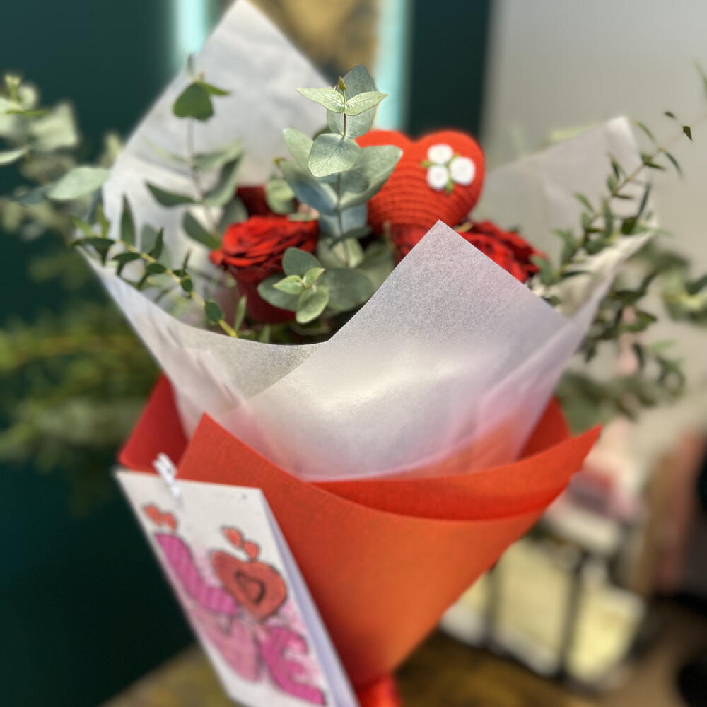 Eucalyptus - 3 pcs Ruscus - 2 pcs radiant red roses - 5 pcs heart hand made - 1 pcs postcard hand made - 1 pcs