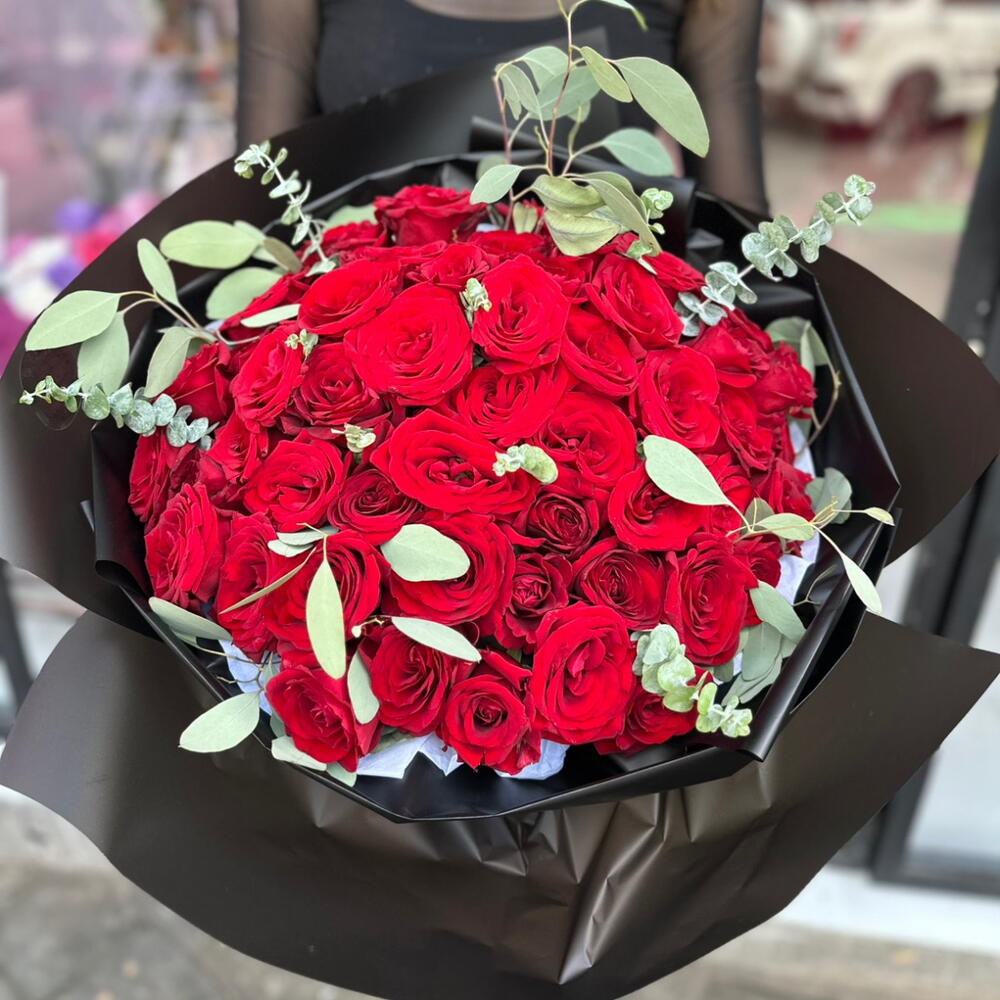 Red rose - 50 pcs Eucaliptus - 5 pcs wrapping paper black - 1 pcs