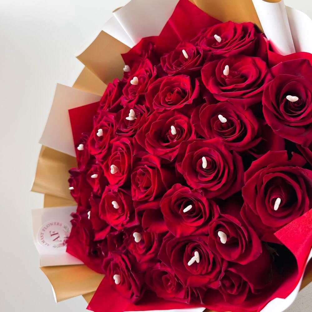 Beautiful mono bouquet created from red roses with Ecuador origin. The shade may vary slightly depending on the specific variety. We guarantee very high quality roses that last a very long time. Stem length 70 cm.