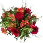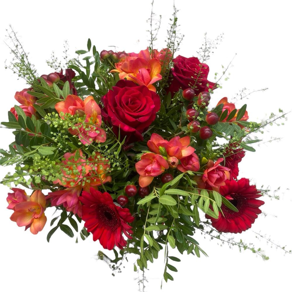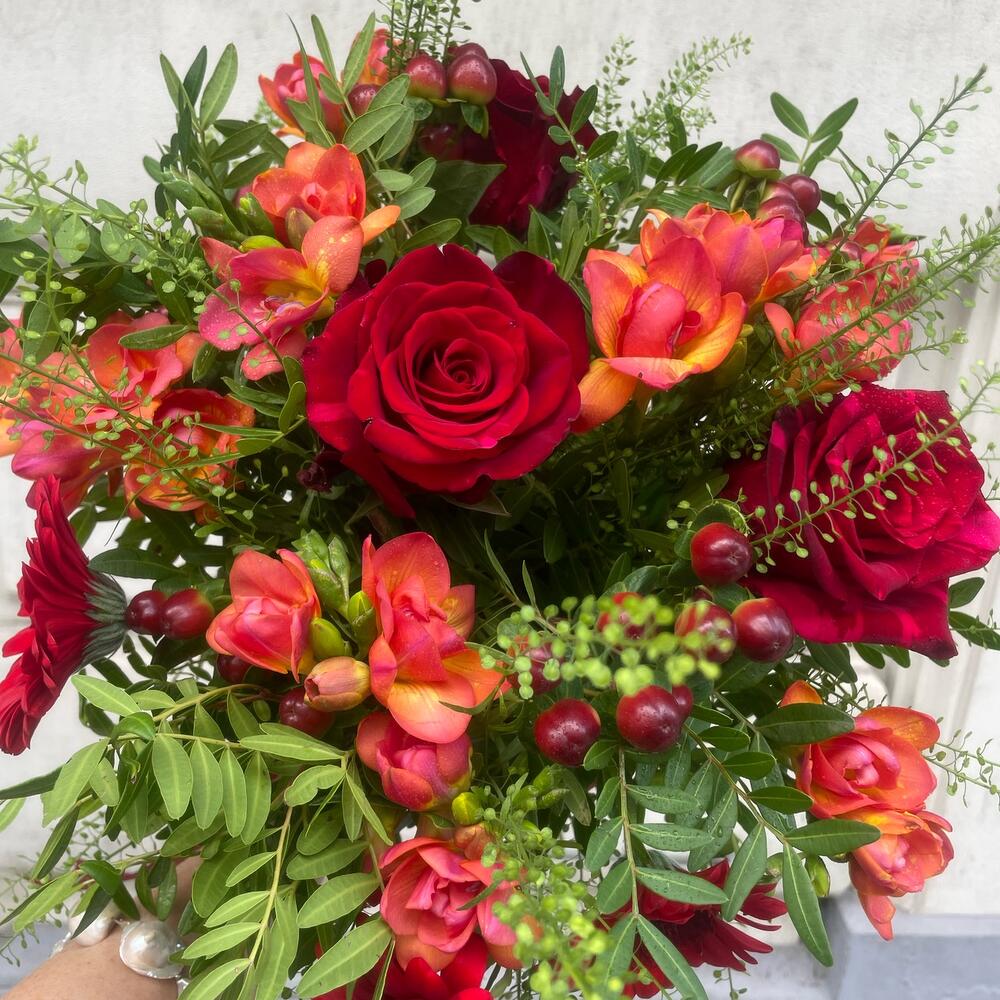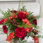 Wow red buquet with loving touch and tender fresia smell.