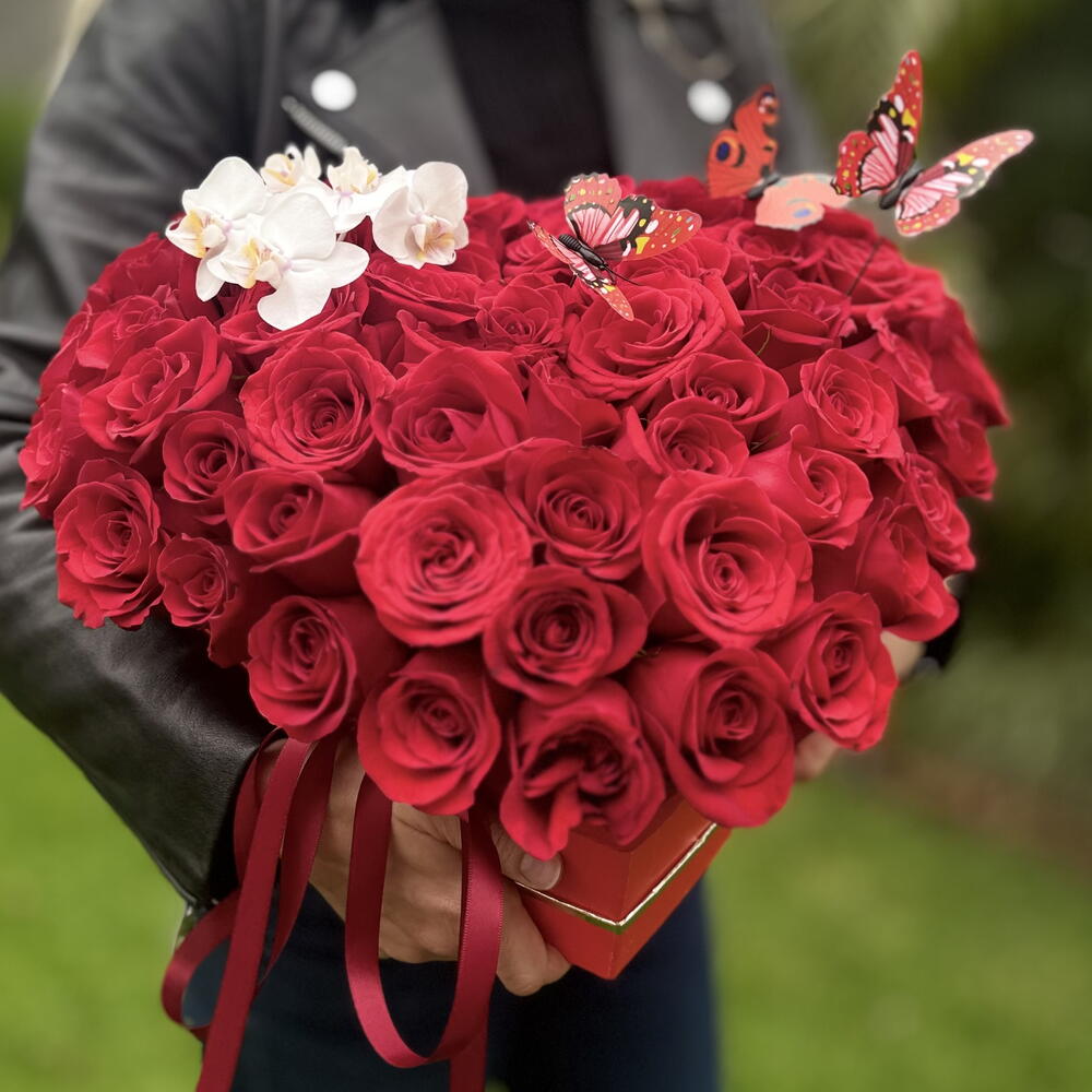 orchids - 5 pcs heart box - 1 pcs butterfly - 2 pcs roses - 50 pcs
