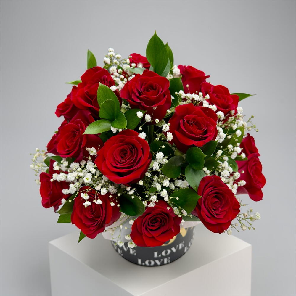 An elegant arrangement of fresh red roses in a stylish LOVE box is a classic and expressive gift for a special person. Bright roses, delicate gypsophila and fresh greenery create a lush and harmonious composition that looks spectacular from all sides. This bouquet is perfect for a romantic gift, anniversary, birthday or any occasion when you want to express your feelings without unnecessary words. Each composition is hand-assembled by WOWBouquet florists from fresh flowers to make the bouquet look beautiful and delight the recipient for as long as possible. Composition composition: • Red roses • Gypsophila • Decorative greenery • LOVE Gift Box