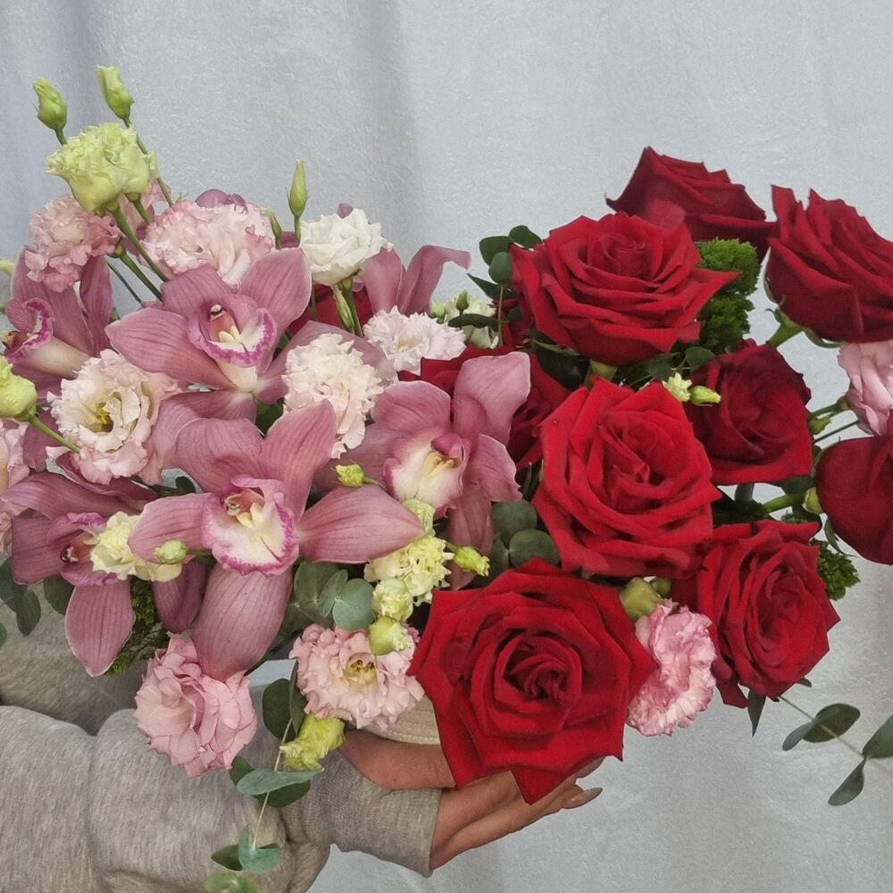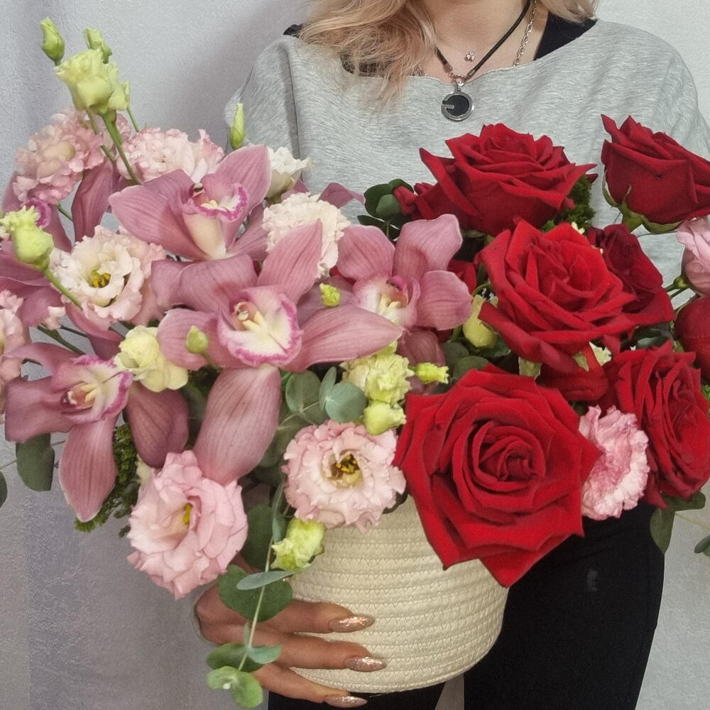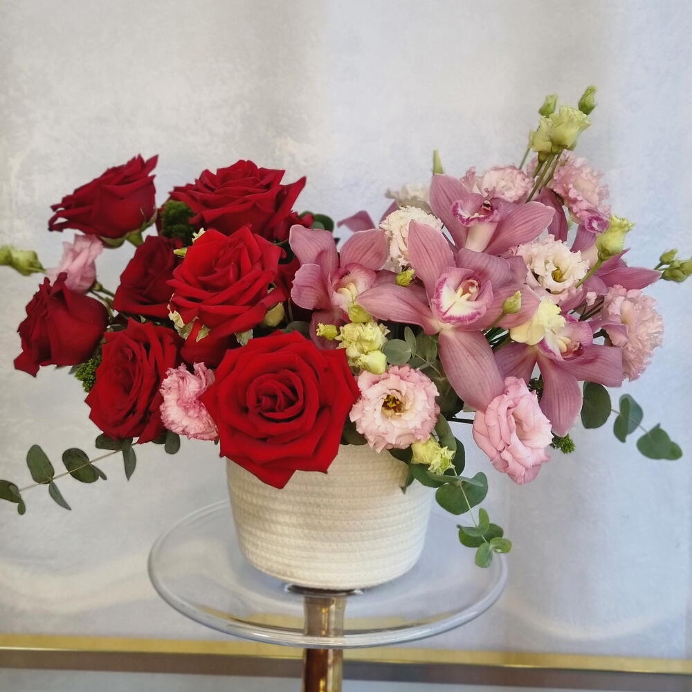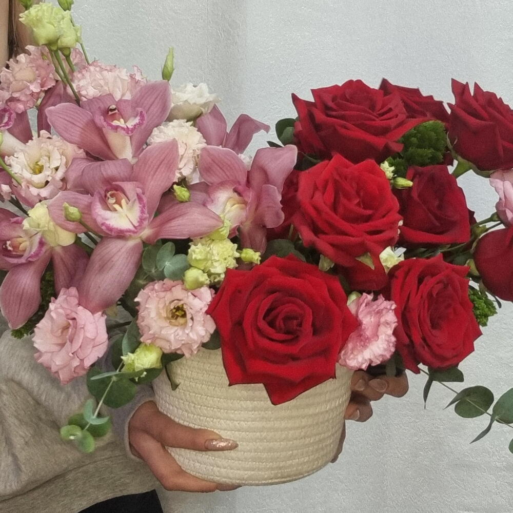 An elegant floral arrangement in a woven basket, featuring rich red roses and delicate pink orchids, complemented with seasonal flowers and fresh greenery. A beautiful choice for birthdays, anniversaries, romantic moments, or special occasions. Flowers, shades, and basket style may vary slightly depending on availability.