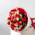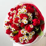 Immerse yourself in the sheer beauty of this Mono Bouquet, meticulously curated with 7 enchanting red tulips and 21 dainty daisies. Picked at the peak of perfection, these flowers radiate with breathtaking vibrancy, creating a stunning spectacle of contrasting colors. This bouquet makes the perfect token of love and admiration for any occasion, ready to bring joy and charm to its recipients.
