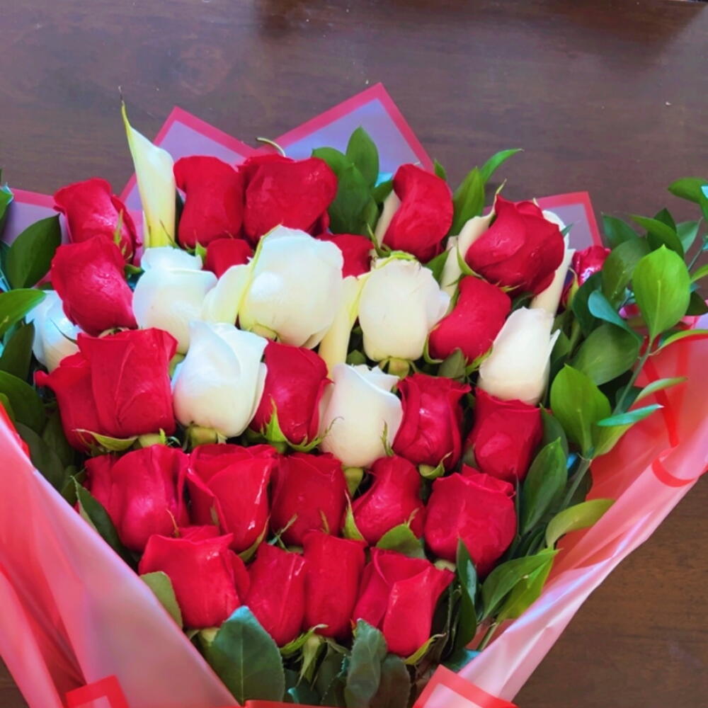 A bouquet featuring 36 long-stemmed roses, elegantly arranged in alternating layers of red and white.