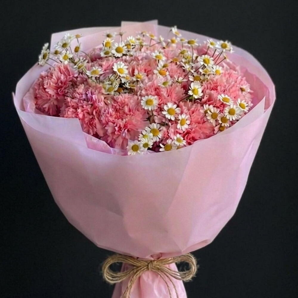 An incredibly sweet and exceptionally long-lasting bouquet! This charming arrangement features a dense base of soft pink carnations (dianthus) beautifully sprinkled with delicate white chamomile (matricaria) daisies. Both flowers are absolute champions of longevity, ensuring your gift stays fresh for weeks. Wrapped in layered pink paper, it’s a heartwarming and lovely gift for Mother's Day, birthdays, or just to show you care. Tags: Pink carnations, Chamomile, Matricaria, Long-lasting flowers, Pink bouquet, Sweet gift, Mother's day, Dianthus.