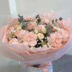 dianthus - 15 pcs gypsophila - 4 pcs decorative greenery - 3 pcs decorative paper - 7 pcs yellow rose - 6 pcs
