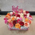 Gypsophila - 10 pcs basket l - 1 pcs red roses - 6 pcs orange roses - 6 pcs pink roses - 13 pcs white roses - 5 pcs