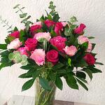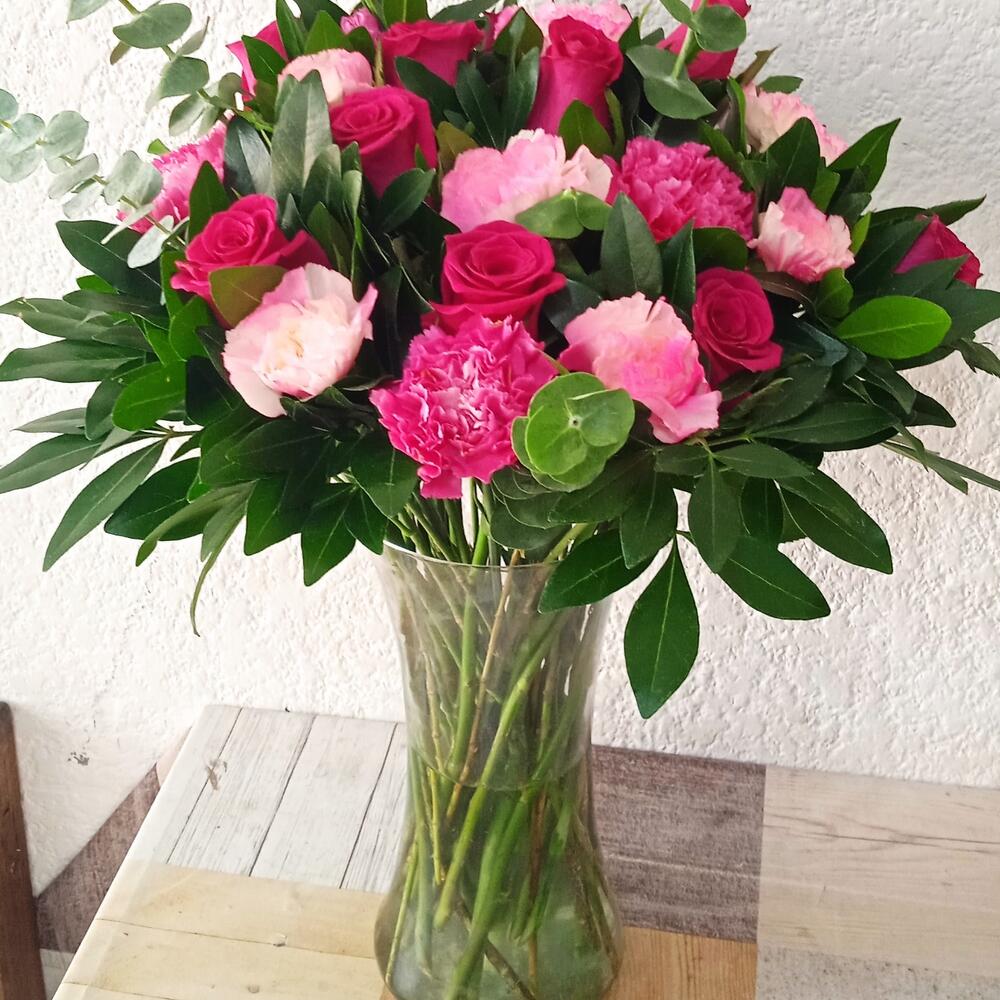 eucalyptus - 10 pcs claveles rosas - 10 pcs rosas fiucsa - 12 pcs