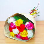 Ramo simples com Rosas do Equador de cores variadas embrulhado em papel pardo e atado de ráfia.