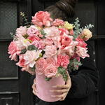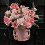 Eustoma - 5 pcs Box - 1 pcs Eucalyptus - 3 pcs Tulip - 7 pcs Oasis - 1 pcs rose - 8 pcs dianthus - 5 pcs spray - 3 pcs