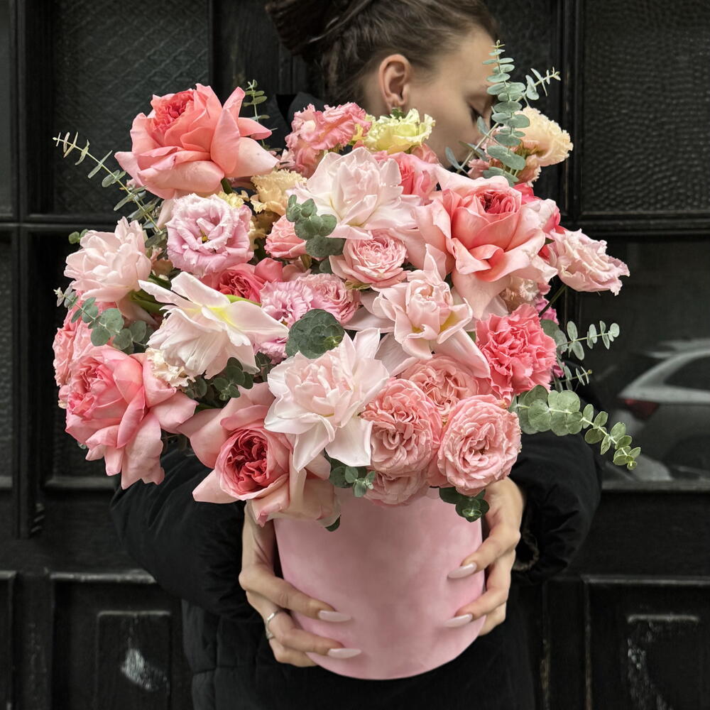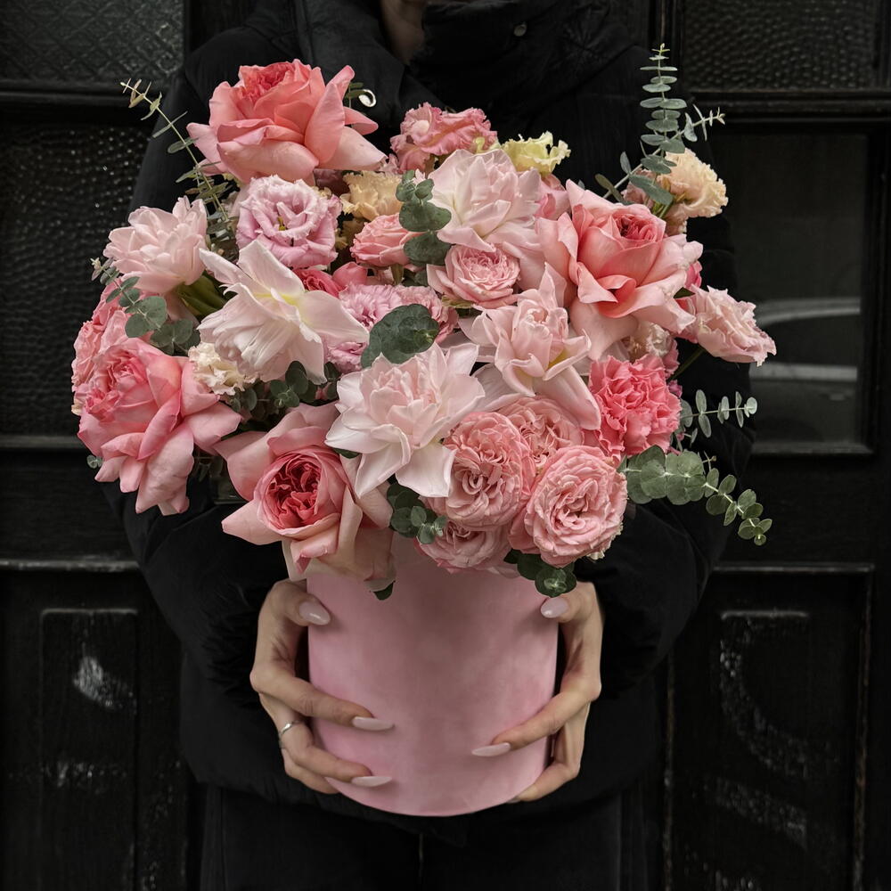 Eustoma - 5 pcs Box - 1 pcs Eucalyptus - 3 pcs Tulip - 7 pcs Oasis - 1 pcs rose - 8 pcs dianthus - 5 pcs spray - 3 pcs