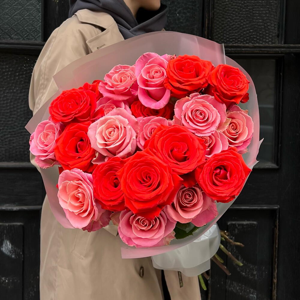 A timeless classic — a mono bouquet of 25 Ecuadorian roses! Scarlet roses of the Nina variety paired with delicate pink Hermosa roses create a refined and romantic combination, perfect for a heartfelt declaration of love to your special someone 🌹❤️🔥