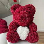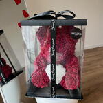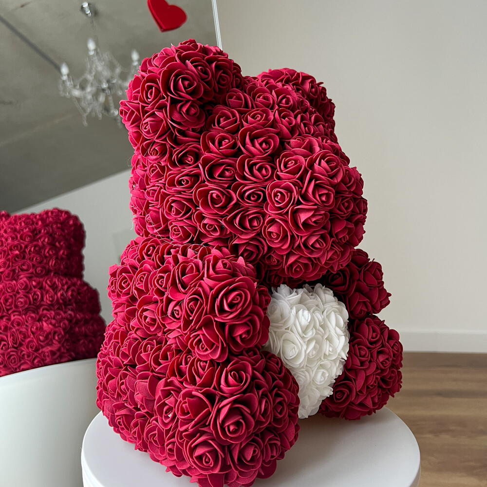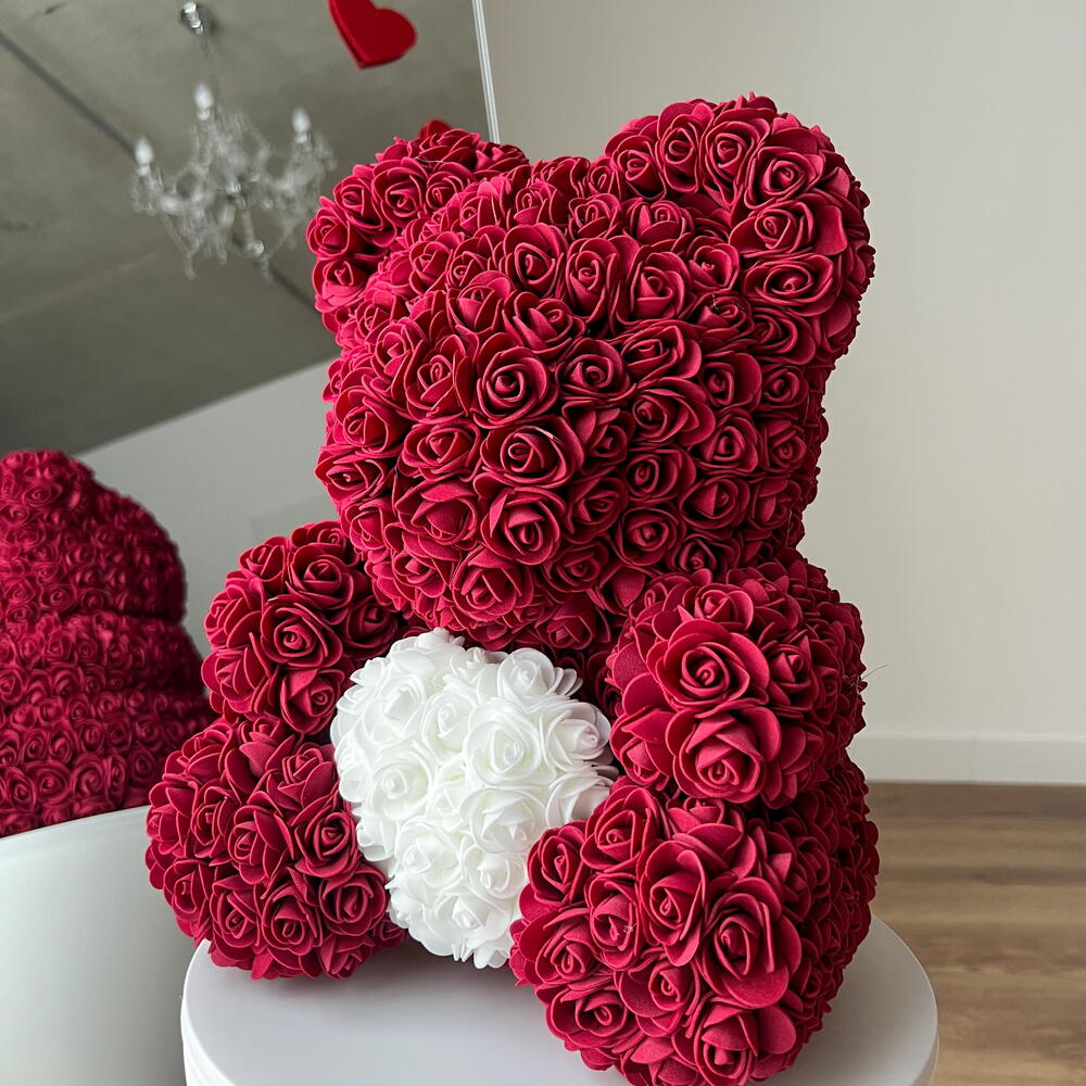 Rosenbär weinrot mit Rosen Herz M Die Bärchen wurden nach dem Klassischen Spielzeug „Teddy Bear“, das seit über 20 Jahren berühmt ist, erschaffen. Jeder Bär wird in Handarbeit aus mehr als 500 PE-Schaumstoff Rosen, die sehr angenehm anzufassen sind, erstellt. Ein Bärchen aus diesen Rosen hat es noch nicht geschafft zur Alltäglichkeit zu werden, deshalb wird Ihr Geschenk nicht nur das knuffigste, sondern auch das originellste und das markanteste. Bei Art Floral achten ganz besonders auf die Qualität. Dabei legen wir bei unseren Bären den Wert auf jede einzelne Blume. Die Form, die Dichte der Blumen, der feste Sitz jeder einzelner Blume sind drei wichtigste Kriterien. Ein Bärchen aus diesen Rosen hat es noch nicht geschafft zur Alltäglichkeit zu werden und ist deshalb ein Hingucker in jeder Alltäglichen Situation. Die Bärchen benötigen keine besondere Pflege, wir empfehlen keine direkte Sonneneinstrahlung, um das verblassen der Farben zu vermeiden. In diesem Fall wird der Bär über lange Jahre Freude bereiten. Zum Entstauben, den Bären einfach mit dem Fön abpusten. Sollte der unwahrscheinliche Fall eintreten, dass eine Blume abfällt, kann diese einfach mit einem Heißkleber wieder angeklebt werden.