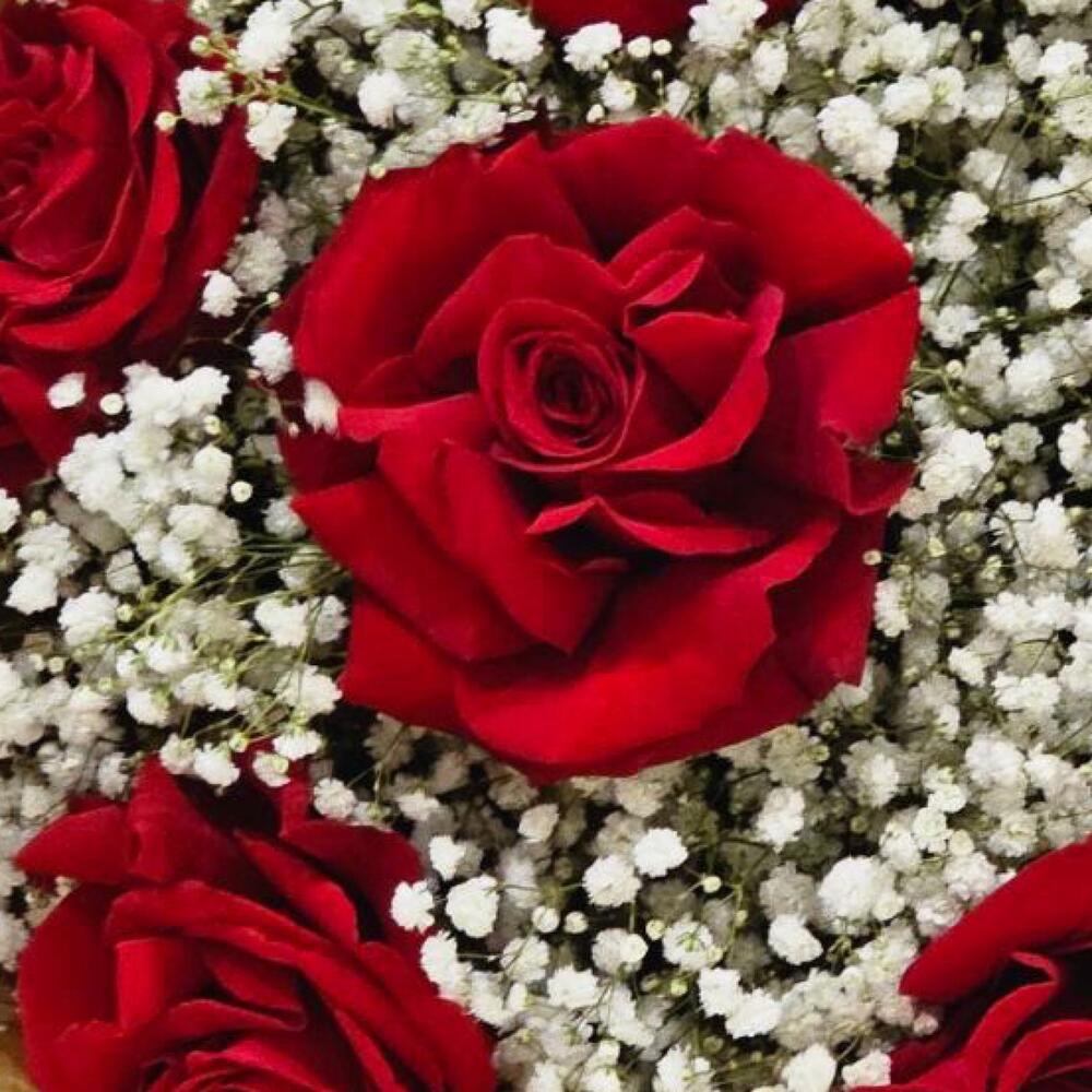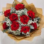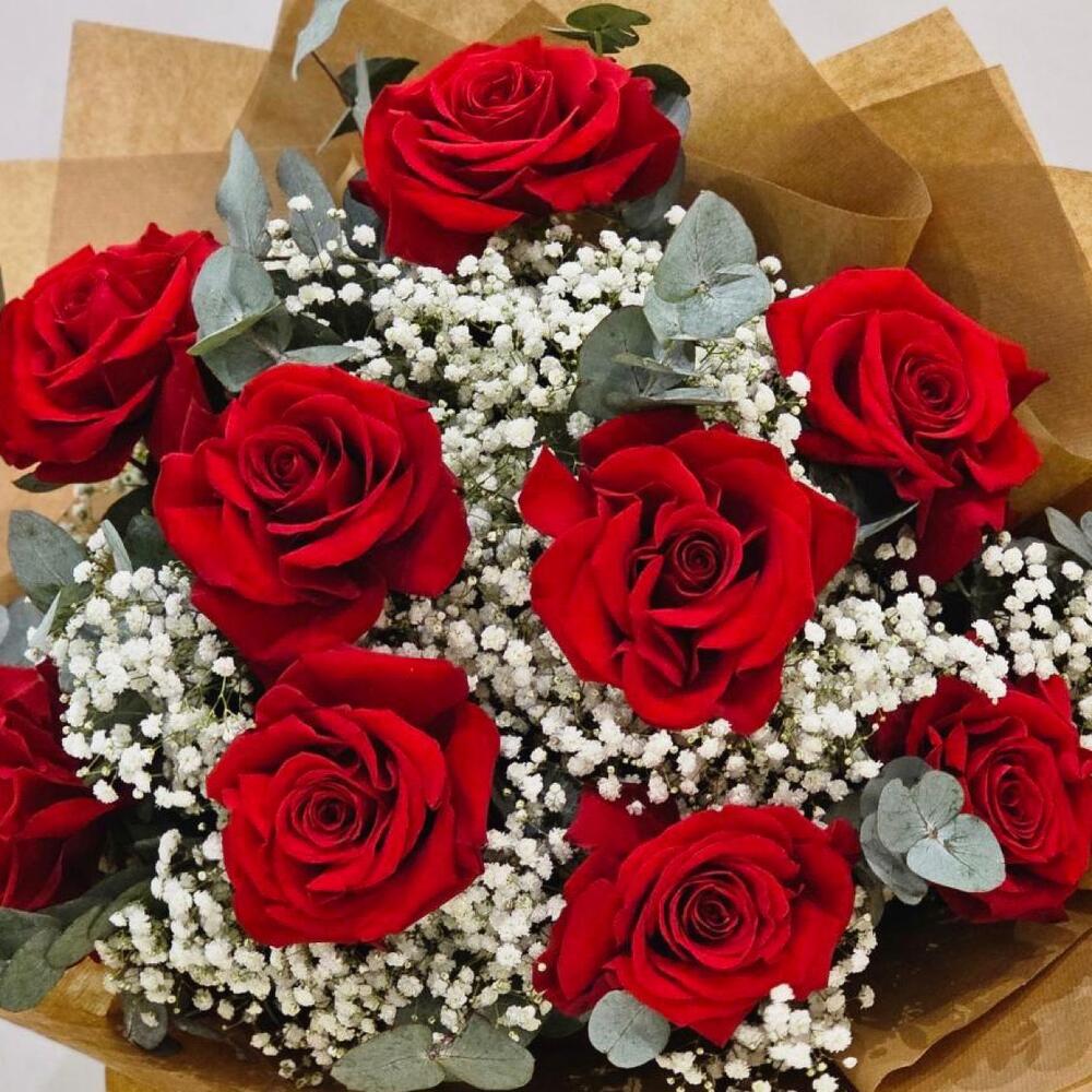 Roses 9 pcs Gypsofhila 10 pcs Eycaliptus 5 pcs Paper 6 pcs Ribbon 1 pcs