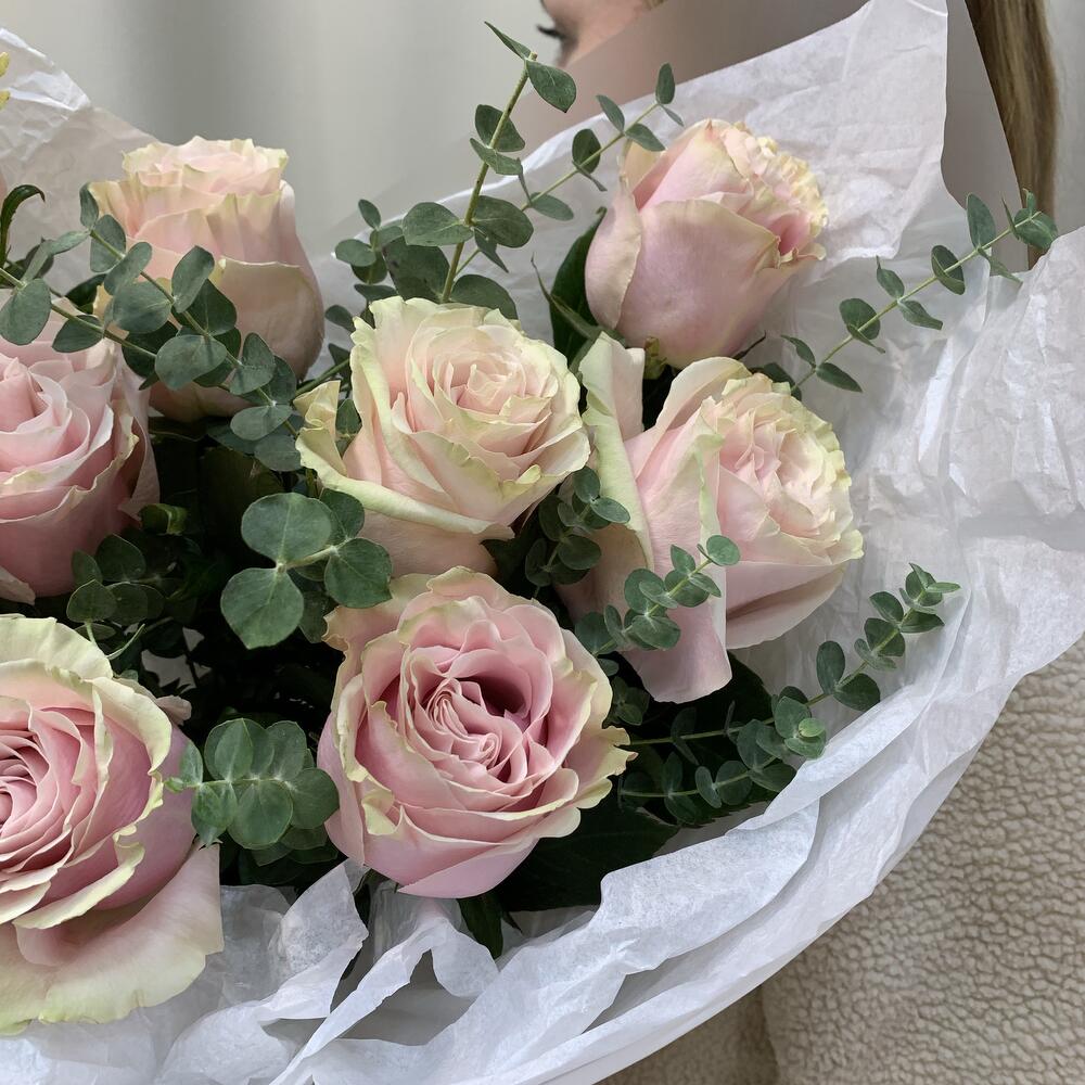 Roses pink with eucalyptus
