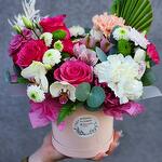 Eustoma - 1 pcs Eucalyptus - 3 pcs Ruscus - 1 pcs Box - 1 pcs Alstroemeria - 1 pcs Pistacia - 2 pcs rose - 3 pcs santini - 2 pcs dianthus - 2 pcs dianthus spray - 1 pcs palm leaf - 1 pcs rumora - 1 pcs