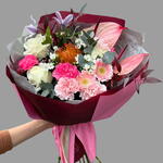 Gerbera - 2 pcs Clematis - 1 pcs Ruskus - 3 pcs dianthus - 5 pcs anthurium - 2 pcs rose - 3 pcs eucalyptus - 3 pcs leukospermum - 1 pcs bauwardia - 2 pcs
