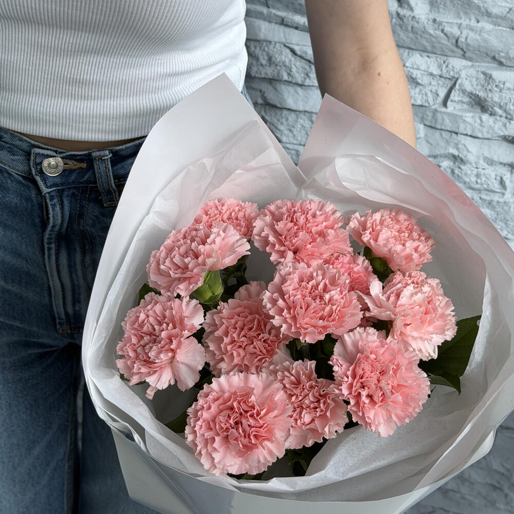 Give someone a smile with our Rosy Cloud bouquet — twelve delicate pink carnations gathered in a perfect little mood boost! This cute mini decoration is designed to brighten up someones day and show care without anything superfluous and without bulky gifts.