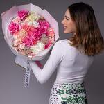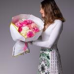 Букет красивый получился. Доставили немного позже назначенного времени, не критично для нас это было. Фото отчет сделали быстро. Доставка считаю дорогая, плюс большие розы не первой свежести были.