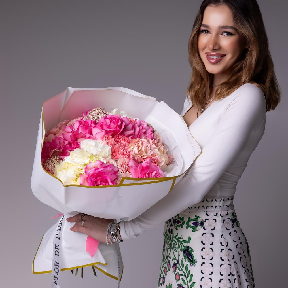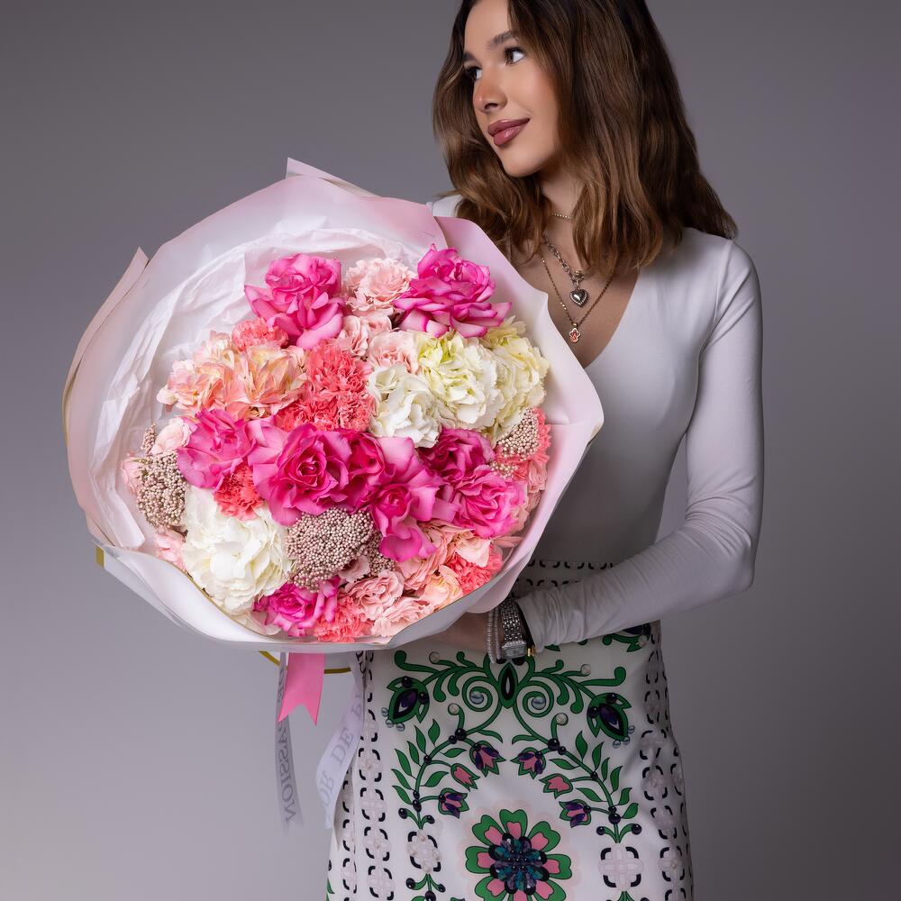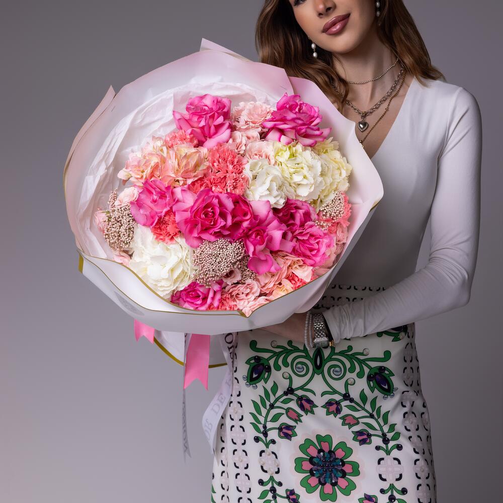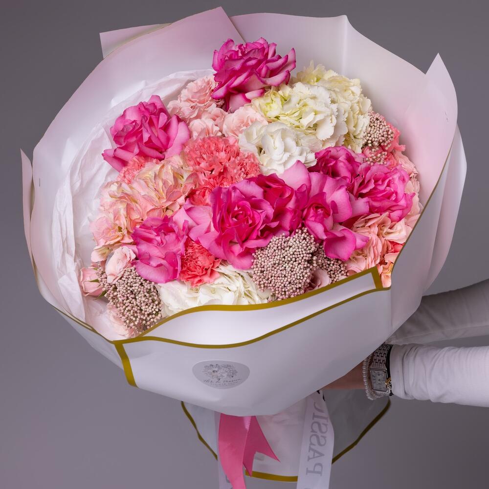 white hydrangea - 3 pcs pink hydrangea - 2 pcs dianthuses pink - 10 pcs pink spray roses - 6 pcs pink french roses - 10 pcs pink rice - 4 pcs