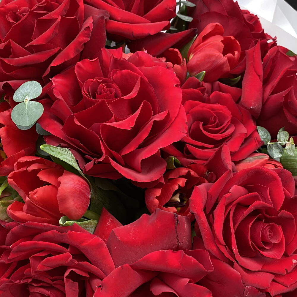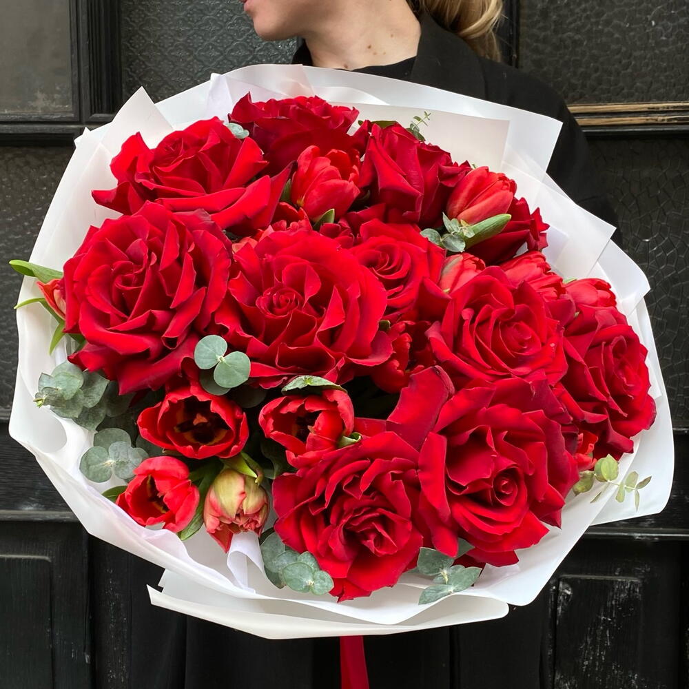 Eucalyptus - 3 pcs Tulips - 18 pcs Ecuadorian rose - 11 pcs packaging - 1 pcs