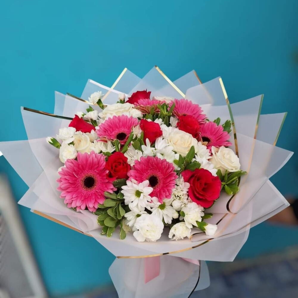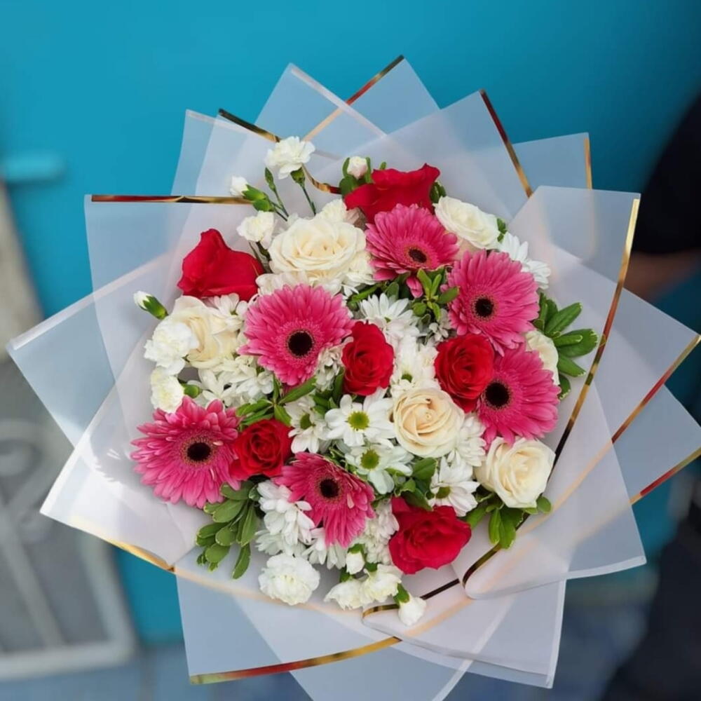 margaritas - 12 pcs rosas rojas - 6 pcs rosas blancas - 6 pcs Gerbera rosa - 6 pcs