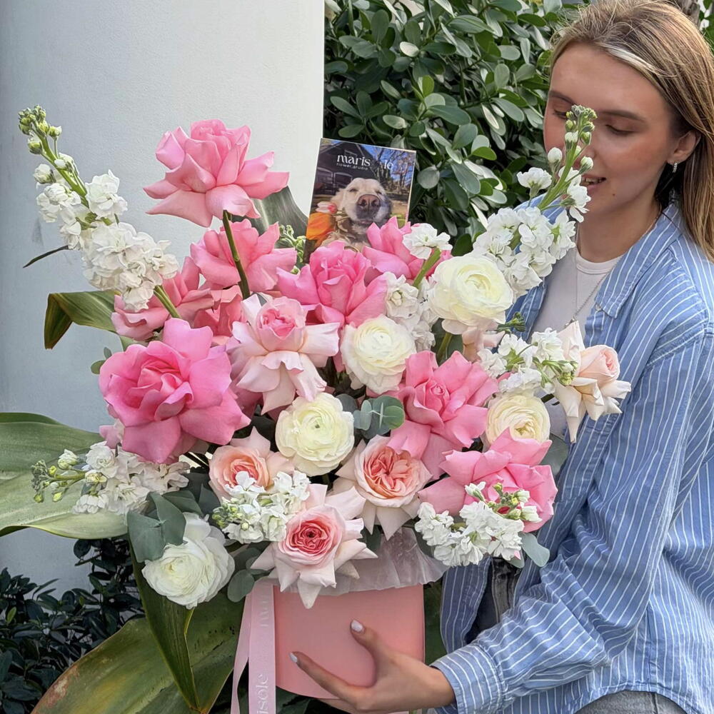 Elevate your space with our Royal Garden Box, a luxurious arrangement featuring premium garden roses, delicate French roses, romantic ranunculus, charming stock flowers, and lush eucalyptus greenery. This carefully curated collection brings together the finest blooms in soft, sophisticated tones, perfect for creating an elegant focal point in any room. Ideal for special occasions, home décor, or as a thoughtful gift, this garden-inspired box delivers fresh, long-lasting beauty that captures the essence of a blooming English garden. The actual bouquet may slightly vary from the photo. Colors, shades, and the natural shape of the flowers can differ, but the style and quality always stay the same.