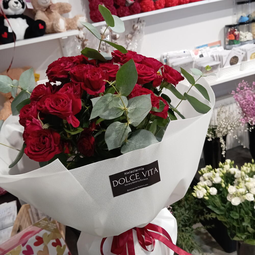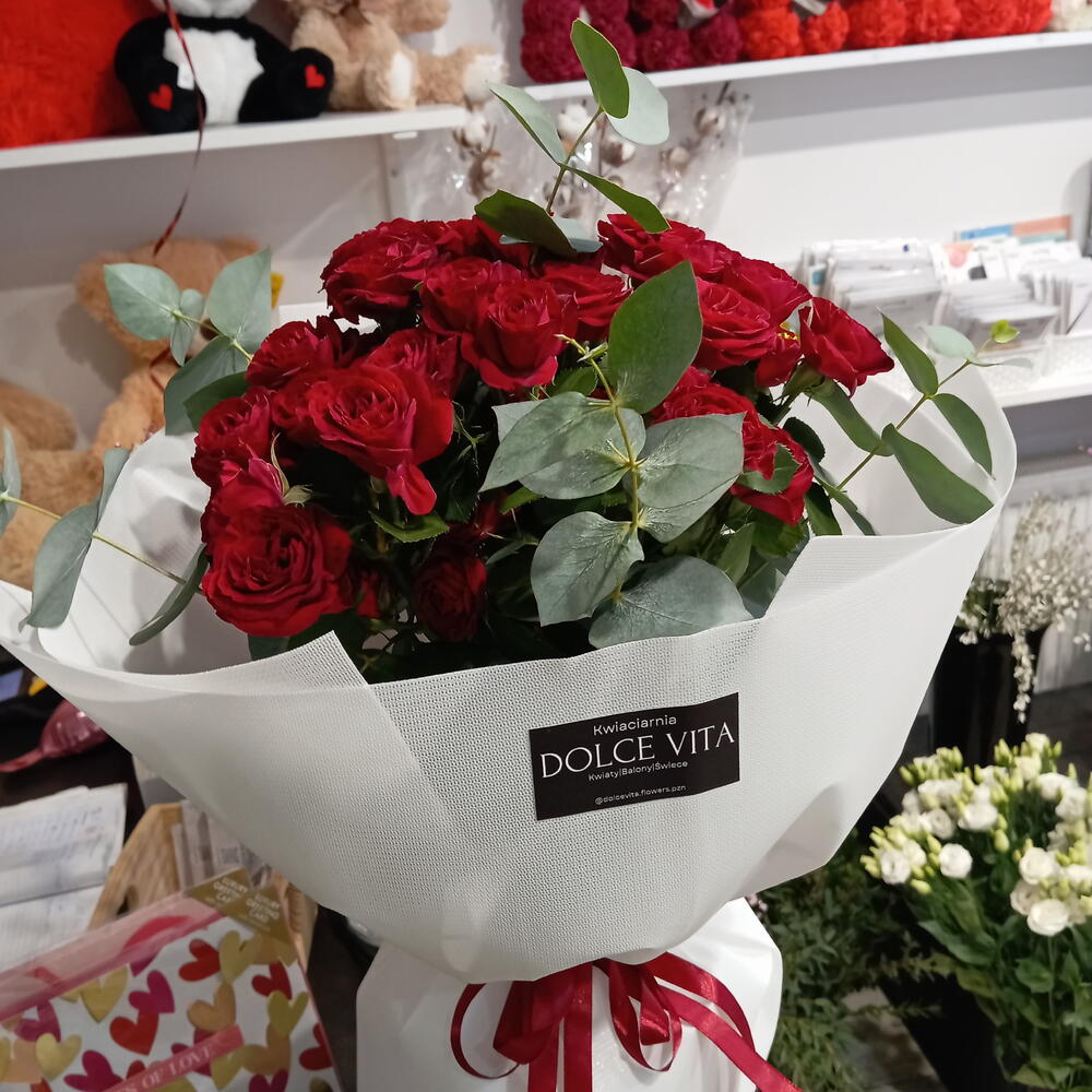 Bouquet of red Goląskowa rose with eucalyptus