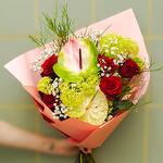 Viburnum - 4 pcs Gypsophila - 3 pcs anthurium green - 2 pcs rudá ekvádorská růže explorer - 7 pcs borůvčí - 4 pcs