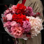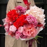 Eustoma - 4 pcs Eucalyptus - 5 pcs Ecuadorian rose - 5 pcs hydrangea - 1 pcs ranunculus - 2 pcs designer wrapping - 1 pcs