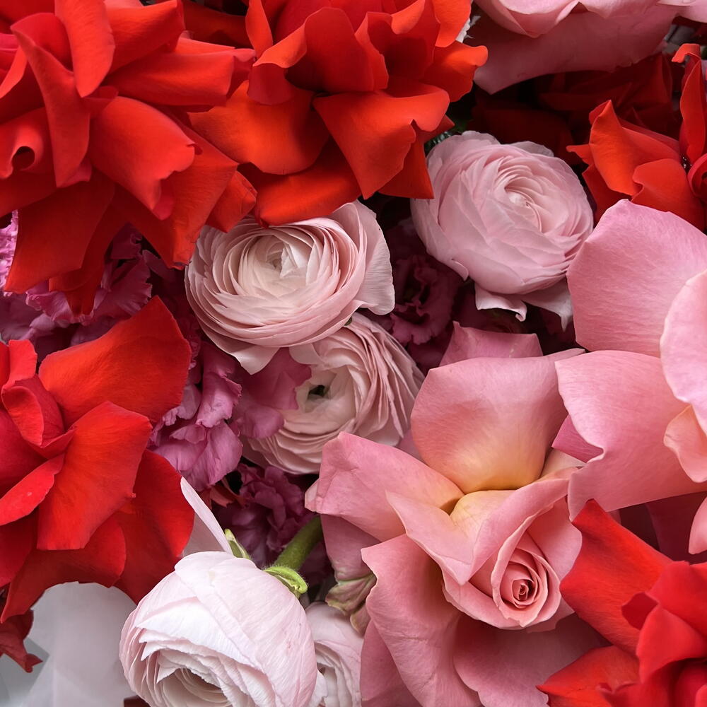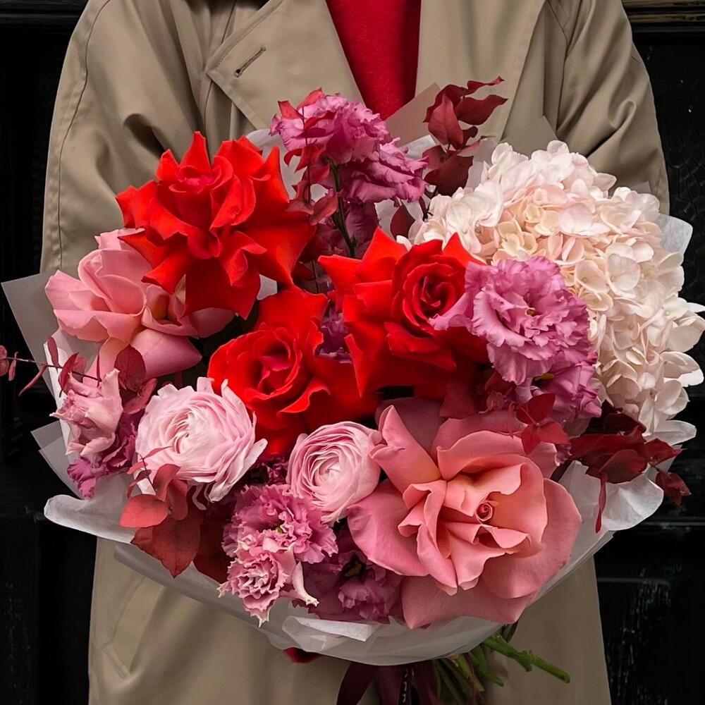 Eustoma - 4 pcs Eucalyptus - 5 pcs Ecuadorian rose - 5 pcs hydrangea - 1 pcs ranunculus - 2 pcs designer wrapping - 1 pcs