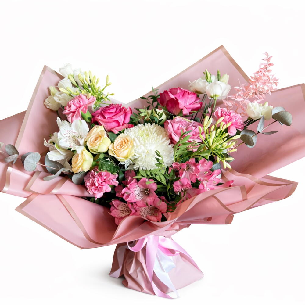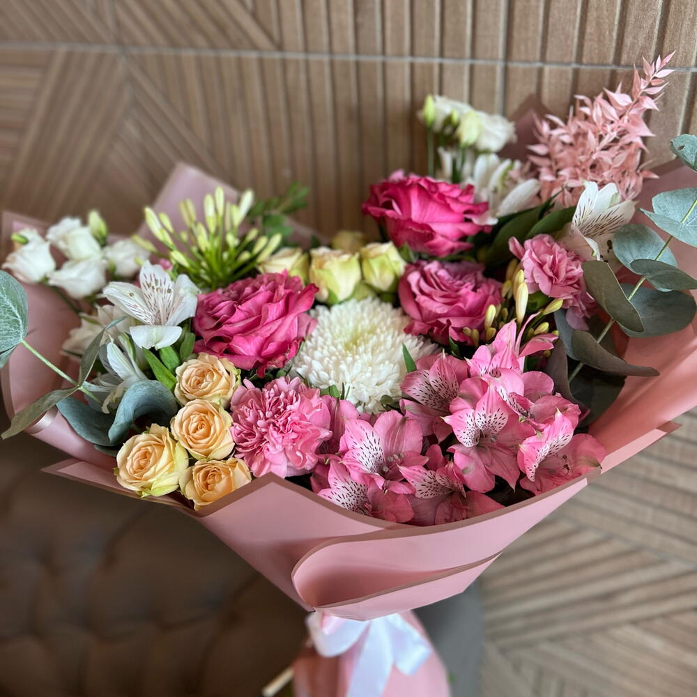 Eustoma - 2 pcs Spray rose - 2 pcs Chrysanthemum - 1 pcs Alstroemeria - 5 pcs Greens - 2 pcs dianthus - 3 pcs ecuador rose 50cm - 3 pcs agapanthus - 2 pcs dried ruskus - 1 pcs