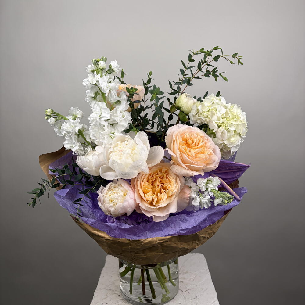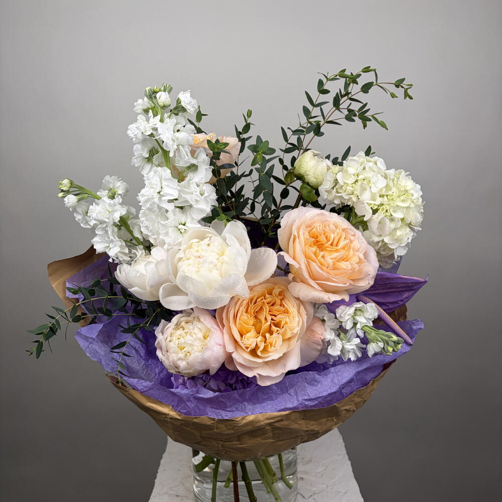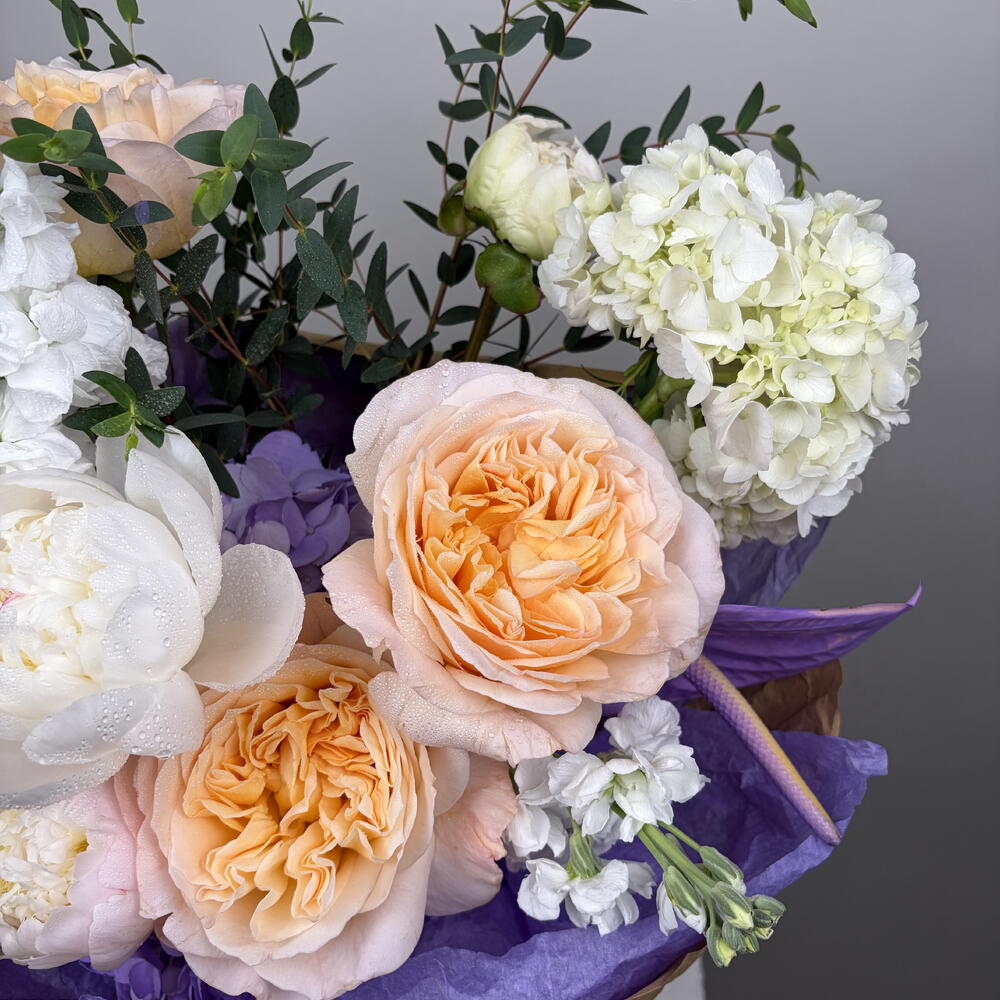 Eucalyptus - 2 pcs Hydrangea - 4 pcs Anthurium - 1 pcs garden rose - 3 pcs stock flowers - 3 pcs henry sass peonies - 4 pcs