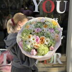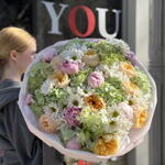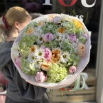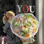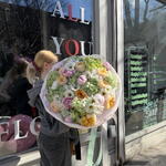 Букет красивый получился. Доставили немного позже назначенного времени, не критично для нас это было. Фото отчет сделали быстро. Доставка считаю дорогая, плюс большие розы не первой свежести были.