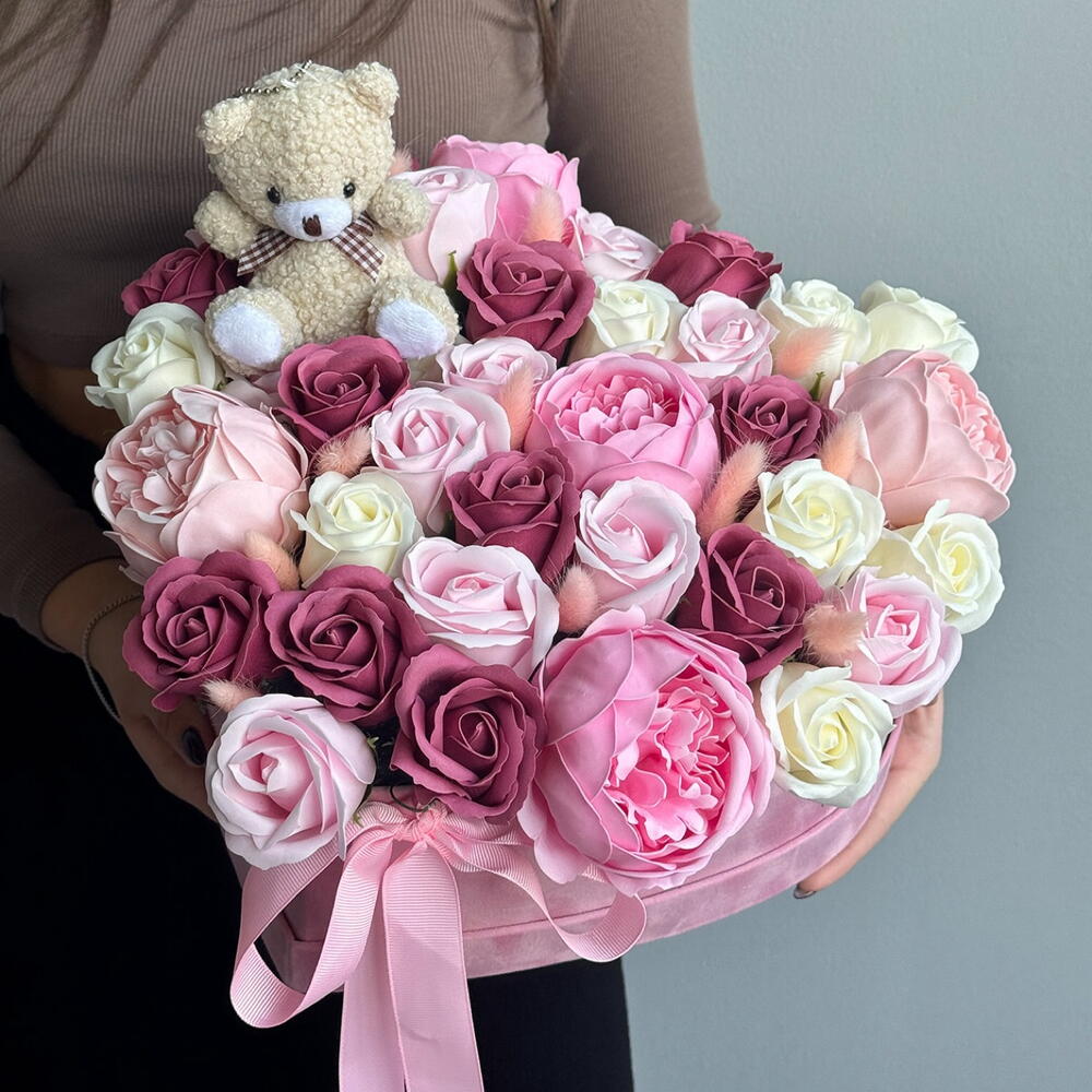 Коробка состоит из: Плюшевый мишка бежевый 8 см - 1 штука Лента розовая - 2 метра Розы из мыльной пены (белая, бледно - розовая, цвет пыльная Роза) - 25 штук Розовые Пионовидные розы из мыльно пены - 5 штук Коробка в виде сердца розовая - 1 штука