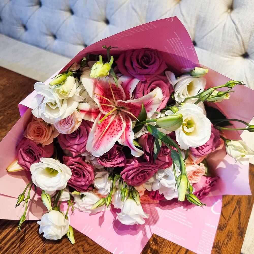 paper wrapping - 2 pcs white hydrangeas - 1 pcs oriental pink lily - 1 pcs white lisianthus stems - 10 pcs purple roses - 9 pcs peach roses 40cm - 7 pcs
