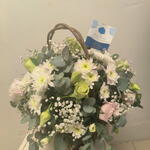 White rose - 4 pcs Gypsophila - 3 pcs white chrysenthemums - 5 pcs arranged in a wooden basket - 1 pcs cream lisianthus - 2 pcs