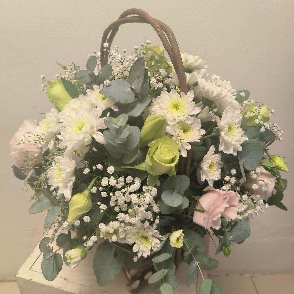 White rose - 4 pcs Gypsophila - 3 pcs white chrysenthemums - 5 pcs arranged in a wooden basket - 1 pcs cream lisianthus - 2 pcs