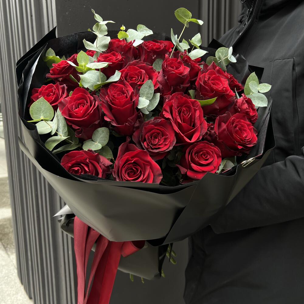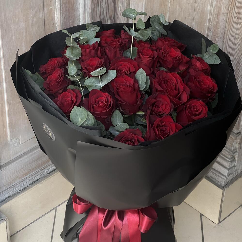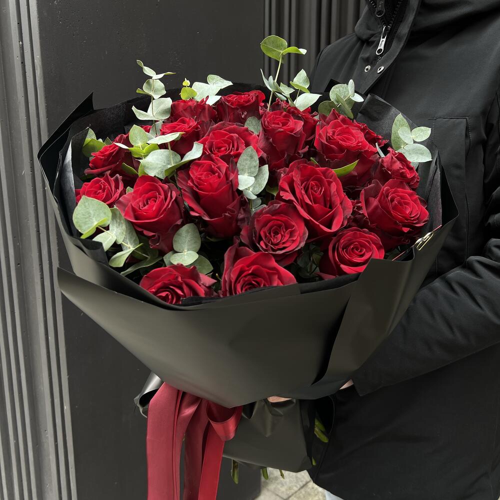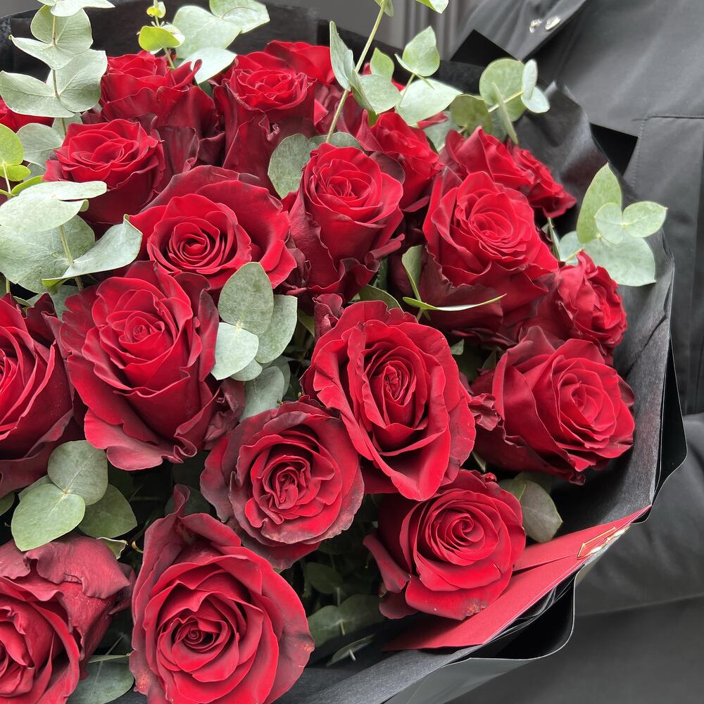 Eucalyptus - 7 pcs Decoration - 1 pcs wrapping paper - 5 pcs red rose vip - 25 pcs
