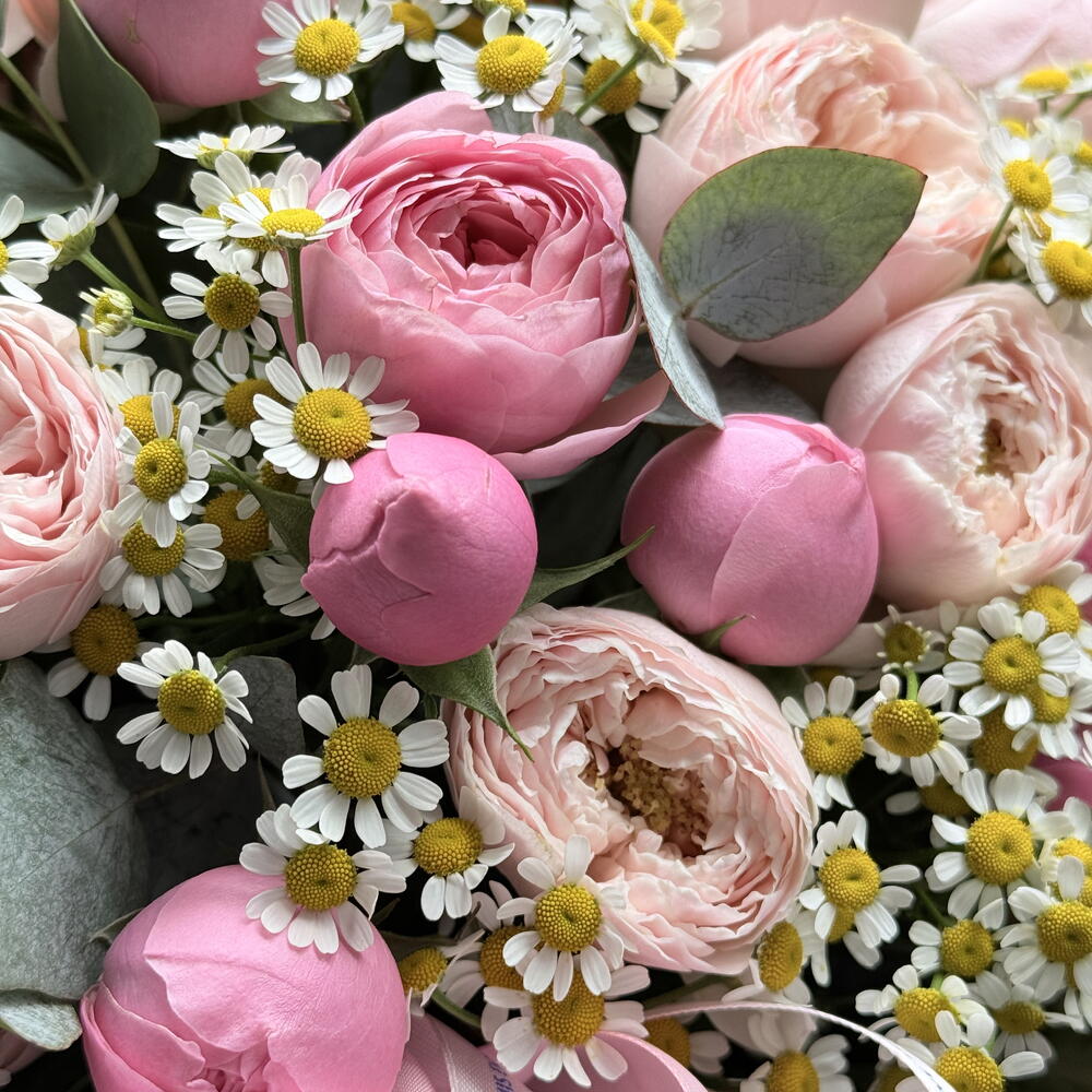 Misty bubbles - 8 pcs matricaria - 1 pcs пионовидные кустовые розы mansfield - 8 pcs