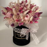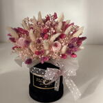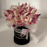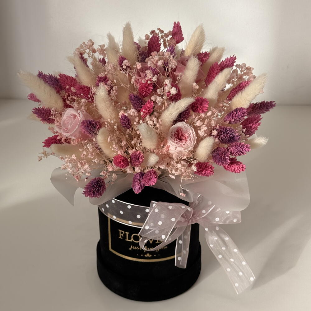 lagurus - 60 pcs lagurus (dried flowers) - 53 pcs flowerbox - 1 pcs leaf - 2 pcs stabilized gypsum - 5 pcs preserved rose - 3 pcs The text "faliaris" does not provide enough context or recognizable content to determine a specific language or to perform a translation. It appears to be either a nonsensical word or a proper noun in an unspecified language. - 30 pcs eucalyptus parvifolia - 7 pcs perfumed paper - 4 pcs