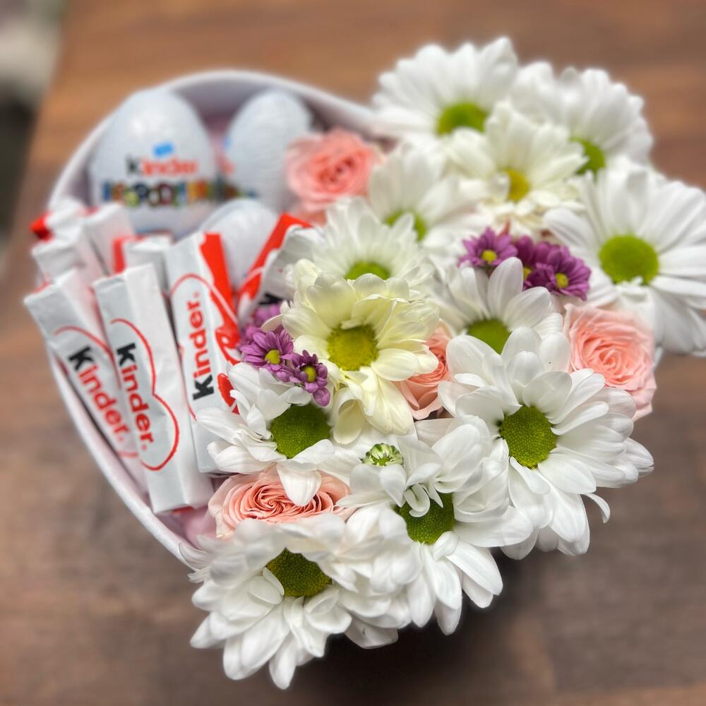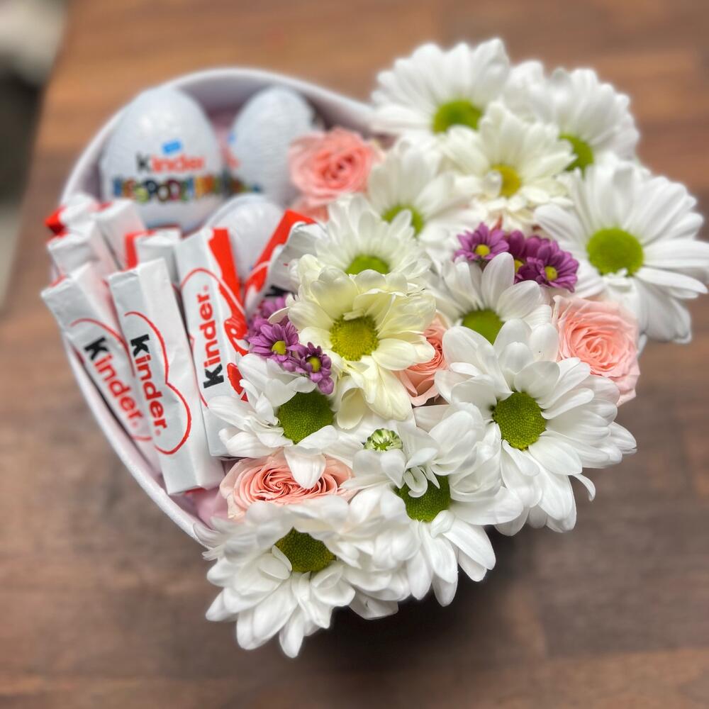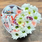 Kinder chocolate - 8 pcs chrysanthemum - 2 pcs spray rose - 1 pcs Kinder egg - 3 pcs