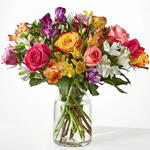 Bring a rainbow of color to any home with this bouquet. Blooming with an assortment of alstroemeria and roses, this vibrant beauty makes the perfect expression for all your special occasions this season. Details Approximately 18H by 17W, featuring approximately 30 stems of florals and foliage. Comes with a clear glass vase. This bouquet comes with floral food and care instructions, packed carefully within a gift box. As soon as you take your bouquet out of the box, trim the stems at an angle and place them in room temperature water with flower food. For long-lasting blooms, replace the water daily.