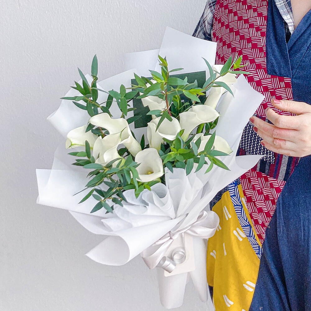 Conatins : 9 White Calla Lilies , Eucalpytus leaves *Do note that fresh flowers, fillers foliage are seasonal and are subjected to changes based on availability. In the event of flower unavailability, it will be substituted with a similar flower of equal or higher value.*