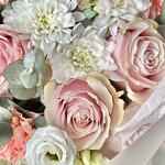 Eustoma - 5 pcs packaging - 5 pcs dianthus - 6 pcs chrysanthemum - 3 pcs eucalyptus - 4 pcs roses - 7 pcs